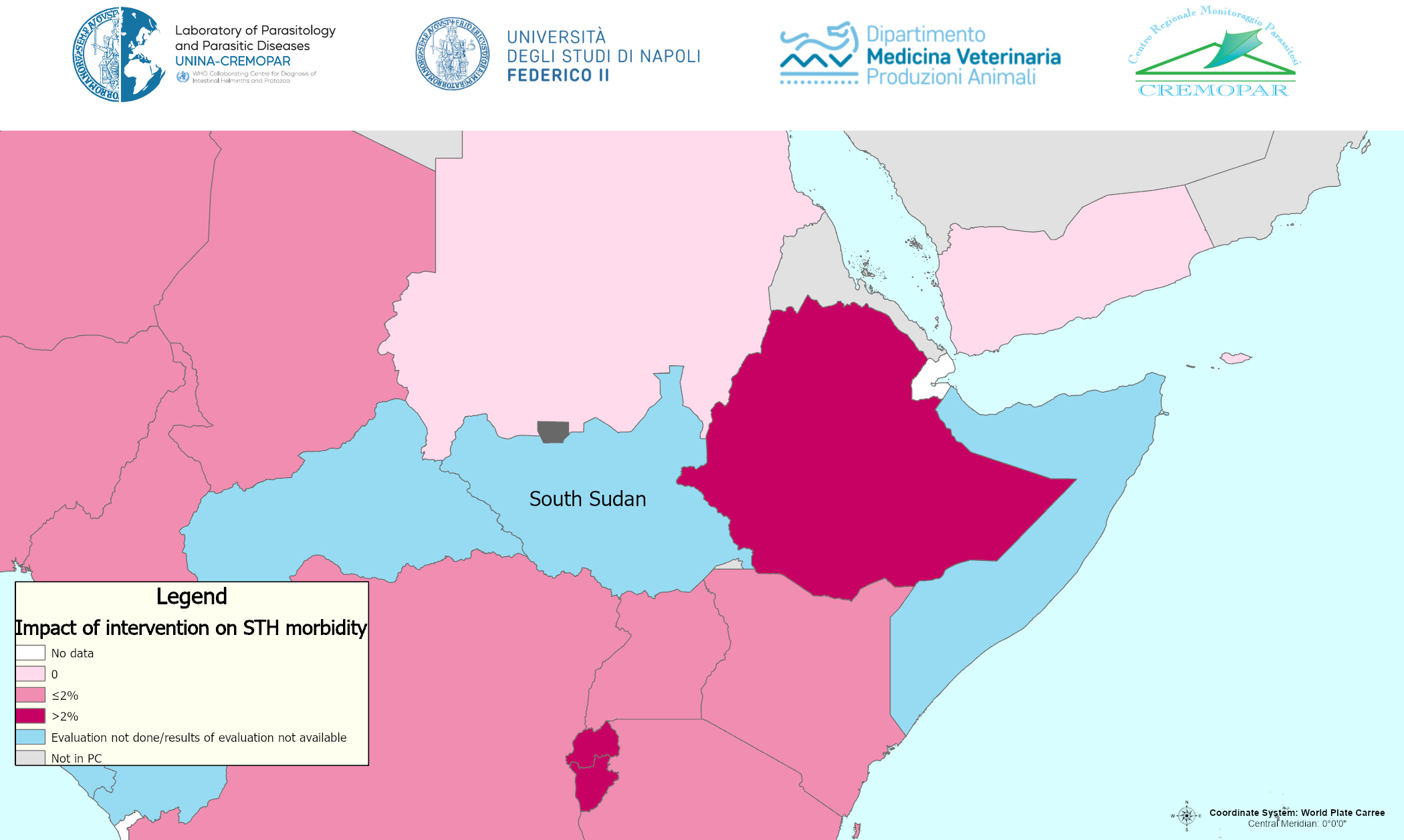 The World Health Organization (WHO) recommends preventive chemotherapy (PC) as the primary intervention to control morbidity of soil-transmitted helminthiasis (STH). In this series of maps we present the impact of the intervention on the morbidity caused by STH (in the case of STH only infections of moderate heavy intensity cause morbidity). The prevalence of infections of moderate heavy intensity (MHI) in countries that after 5 years of intervention conducted impact survey is presented in different shades of pink (https://youtu.be/P2RZE5UoSU0).