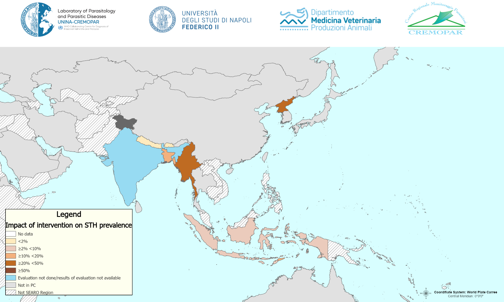 The World Health Organization (WHO) recommends preventive chemotherapy (PC) as the primary intervention to control morbidity of soil-transmitted helminthiasis (STH). In this series of maps we present the impact of the intervention on the prevalence of STH. The STH prevalence in countries that after 5 years of intervention conducted impact survey is presented in different shades of brown (https://youtu.be/P2RZE5UoSU0).
